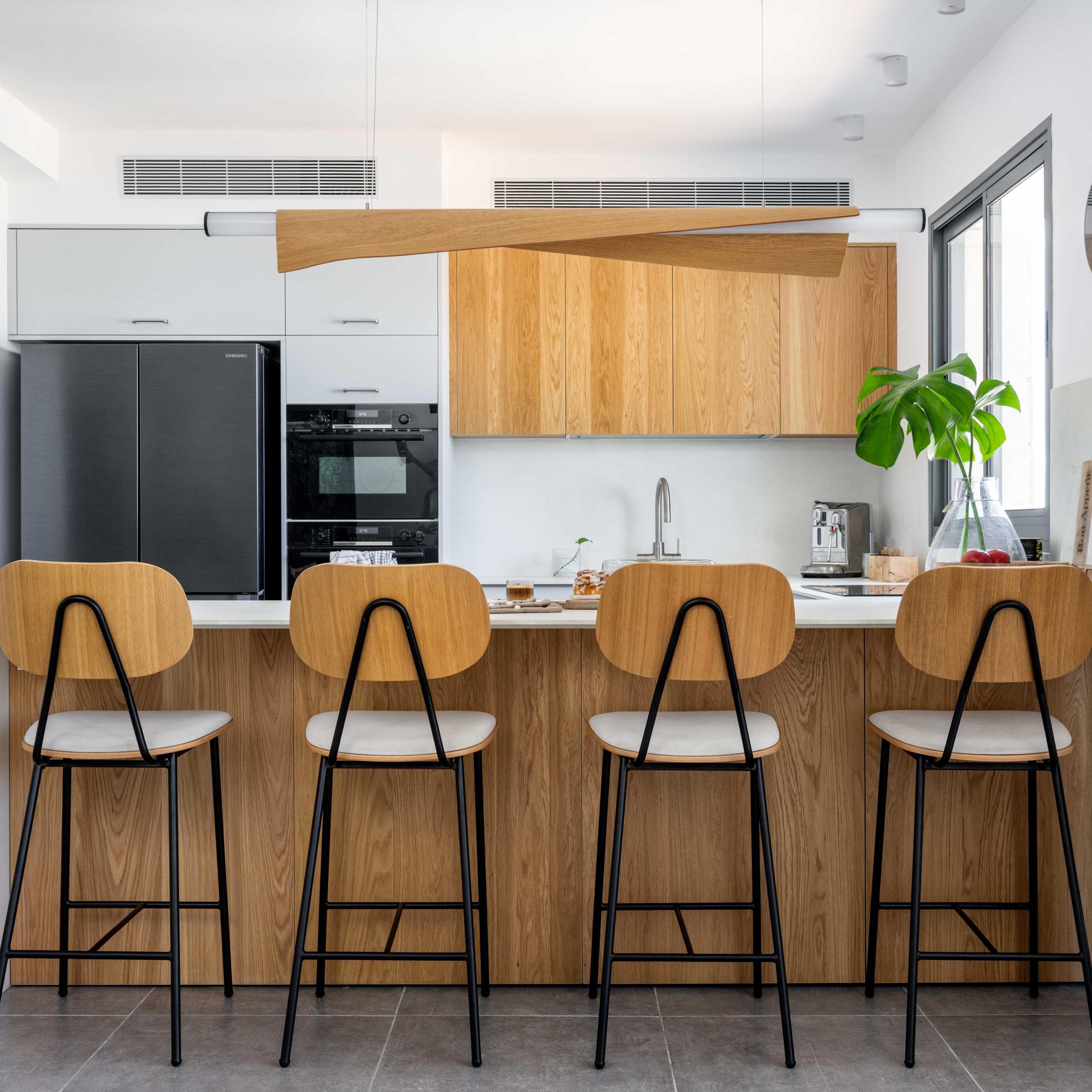 כסא בר דיאן מרופד ייצור בלעדי מקומי מבית Chair2u בעל משענת ומושב עץ אלון/ אגוז/ מושחר בריפוד לפי בחירתך.