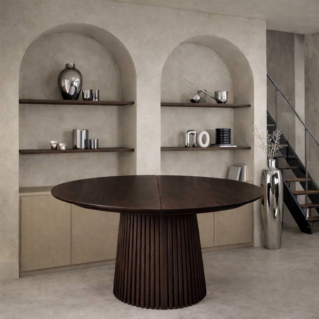 פינת אוכל בסגנון כפרי מודרני קוטר 120 ס"מ מעץ אלון בגוון אגוז איטלקי ופלטה פורניר אלון בגוון אגוז