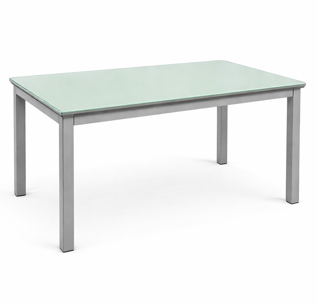 שולחן דגם מוריה במידה 165×90 עשוי פלטת זכוכית ורגלי מתכת כסופות