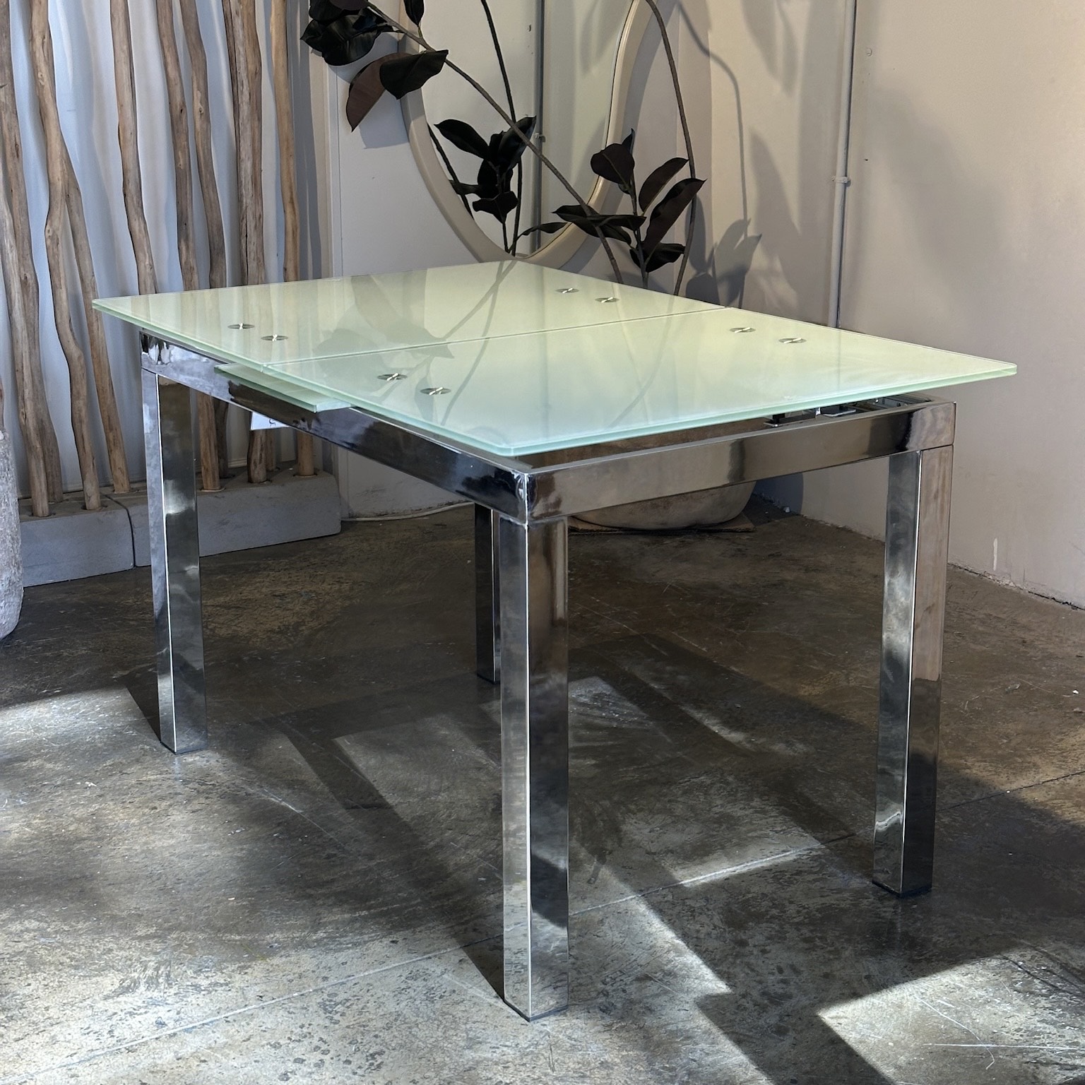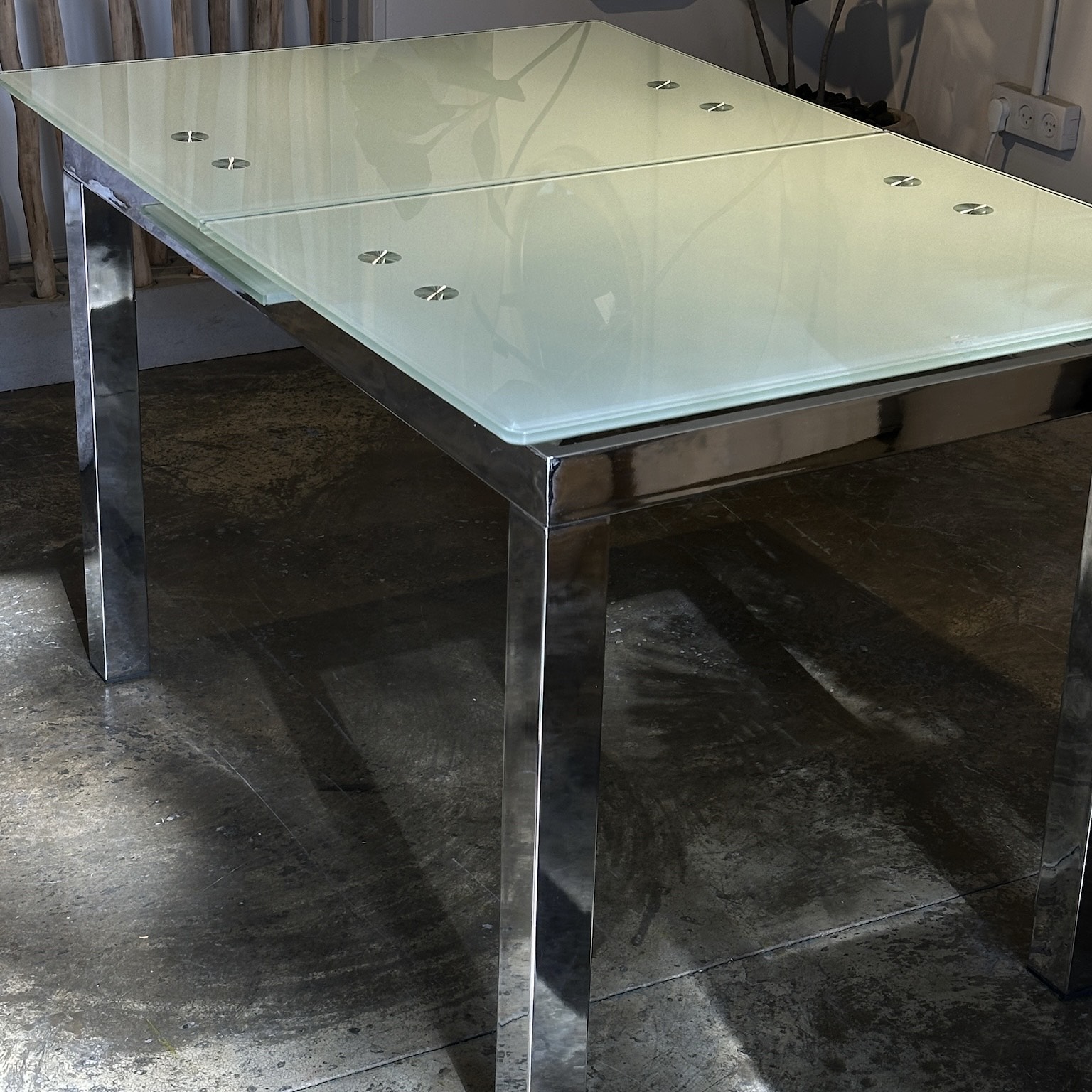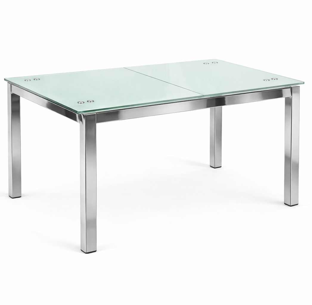 שולחן דגם צלמון במידה 130×80 עשוי פלטה זכוכית ורגלי ניקל מבריקות